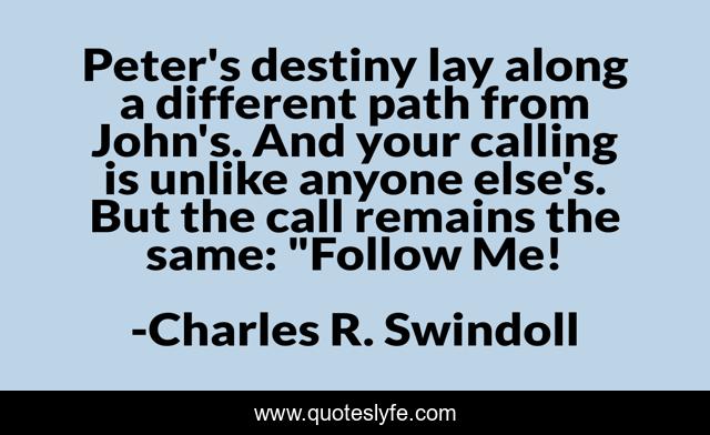 This page presents the quote "Peter's destiny lay along a different path from John's. And your calling is unlike anyone else's. But the call remains the same: "Follow Me!". Author of this quote is Charles R. Swindoll. This quote is about jesus-christ, leadership, peter, purpose, christianity,.