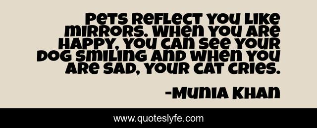 This page presents the quote "Pets reflect you like mirrors. When you are happy, you can see your dog smiling and when you are sad, your cat cries.". Author of this quote is Munia Khan. This quote is about reflection, pet, dog, cat, reflect, cries, philosophical, cats, dogs-loyalty,.