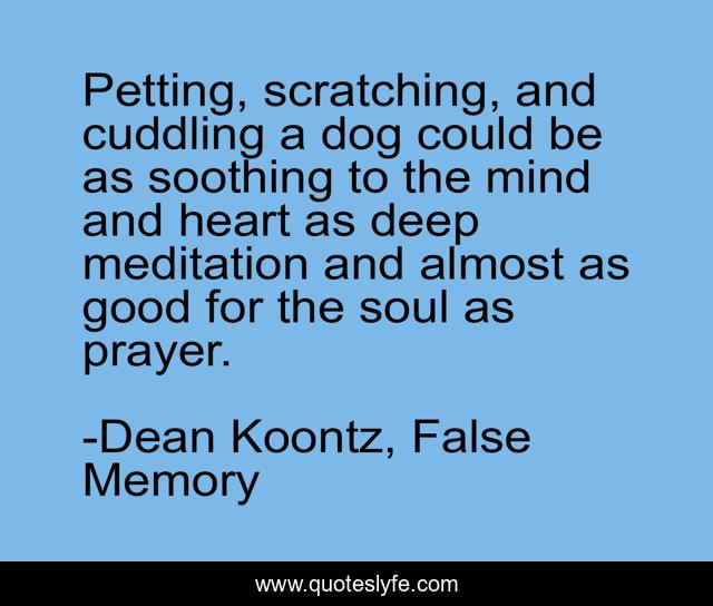 This page presents the quote "Petting, scratching, and cuddling a dog could be as soothing to the mind and heart as deep meditation and almost as good for the soul as prayer.". Author of this quote is Dean Koontz, False Memory. This quote is about animals, dogs,.