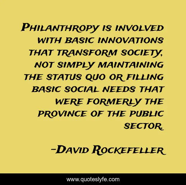This page presents the quote "Philanthropy is involved with basic innovations that transform society, not simply maintaining the status quo or filling basic social needs that were formerly the province of the public sector.". Author of this quote is David Rockefeller. This quote is about philanthropy, social,.