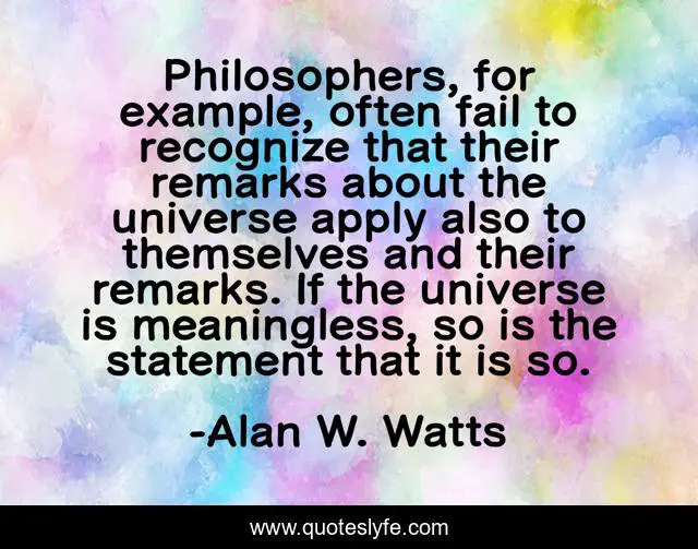 This page presents the quote "Philosophers, for example, often fail to recognize that their remarks about the universe apply also to themselves and their remarks. If the universe is meaningless, so is the statement that it is so.". Author of this quote is Alan W. Watts. This quote is about philosophy, paradox, power-of-words,.