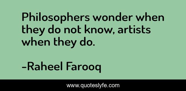 This page presents the quote "Philosophers wonder when they do not know, artists when they do.". Author of this quote is Raheel Farooq. This quote is about artistic-process, art, knowledge, artist, philosophy-and-art, philosophy, artistic-endeavor, philosopher, philosophers,.