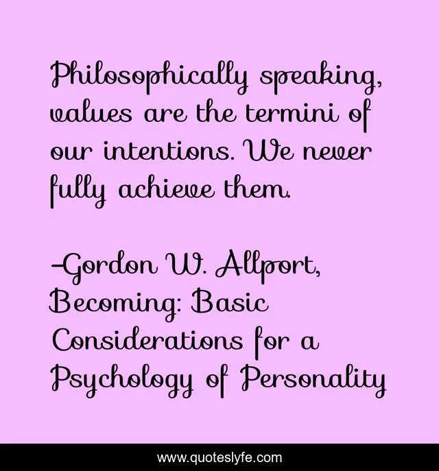 This page presents the quote "Philosophically speaking, values are the termini of our intentions. We never fully achieve them.". Author of this quote is Gordon W. Allport, Becoming: Basic Considerations for a Psychology of Personality. This quote is about personality-theory, becoming, psychology, possibility, personality,.
