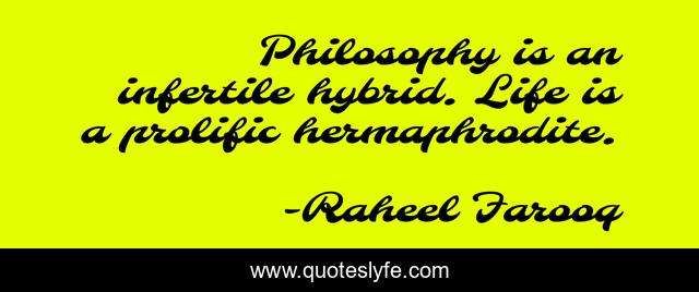 This page presents the quote "Philosophy is an infertile hybrid. Life is a prolific hermaphrodite.". Author of this quote is Raheel Farooq. This quote is about universe, life, philosophy, reason, versatility,.