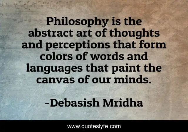 This page presents the quote "Philosophy is the abstract art of thoughts and perceptions that form colors of words and languages that paint the canvas of our minds.". Author of this quote is Debasish Mridha. This quote is about words-and-languages, philosophy, debasish-mridha, debasish-mridha-m-d, quotes, inspirational, abstract-art-of-thoughts, enthusiasm, thoughts-and-perceptions,.