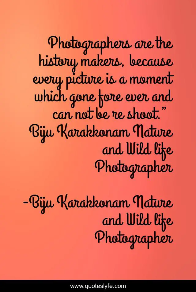 This page presents the quote "Photographers are the history makers, because every picture is a moment which gone fore ever and can not be re shoot.”― Biju Karakkonam Nature and Wild life Photographer". Author of this quote is Biju Karakkonam Nature and Wild life Photographer. This quote is about biju-karakkonam, photography,.