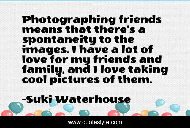 This page presents the quote "Photographing friends means that there's a spontaneity to the images. I have a lot of love for my friends and family, and I love taking cool pictures of them.". Author of this quote is Suki Waterhouse. This quote is about love, friends, family, affection,.