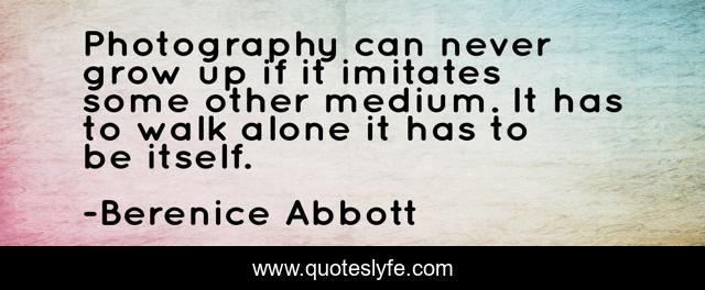 This page presents the quote "Photography can never grow up if it imitates some other medium. It has to walk alone it has to be itself.". Author of this quote is Berenice Abbott. This quote is about photography, grow, walk,.