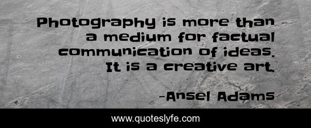 This page presents the quote "Photography is more than a medium for factual communication of ideas. It is a creative art.". Author of this quote is Ansel Adams. This quote is about photography, art, creative,.