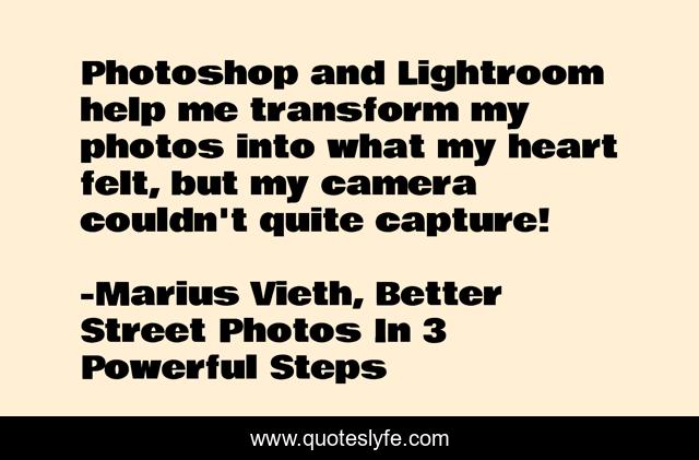 "Marius Vieth, Better Street Photos In 3 Powerful Steps Quotes." Quoteslyfe.com, 2025. Sat. 06 Dec. 2025. <https://www.quoteslyfe.com/quote/Photoshop-and-Lightroom-help-me-transform-my-80964>.
