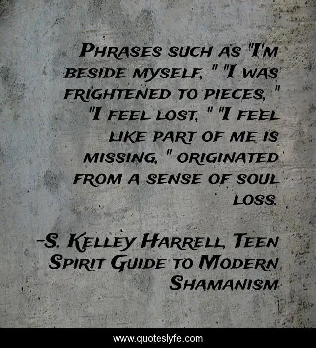 This page presents the quote "Phrases such as "I'm beside myself, " "I was frightened to pieces, " "I feel lost, " "I feel like part of me is missing, " originated from a sense of soul loss.". Author of this quote is S. Kelley Harrell, Teen Spirit Guide to Modern Shamanism. This quote is about soul-retrieval, shamanism, trauma, ptsd, soul-loss,.