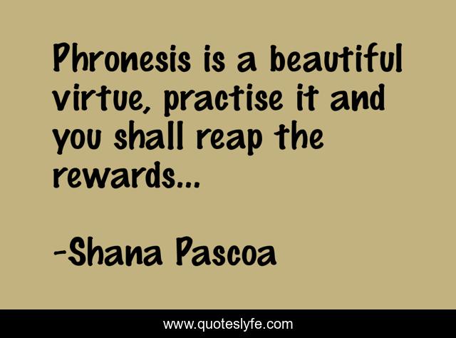This page presents the quote "Phronesis is a beautiful virtue, practise it and you shall reap the rewards…". Author of this quote is Shana Pascoa. This quote is about life, career, work, job, leadership, inspirational, enthusiasm,.