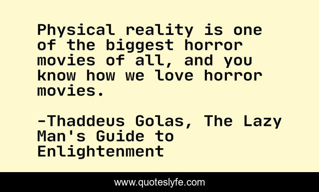 This page presents the quote "Physical reality is one of the biggest horror movies of all, and you know how we love horror movies.". Author of this quote is Thaddeus Golas, The Lazy Man's Guide to Enlightenment. This quote is about choice, reality, ilusion, horror-movies,.