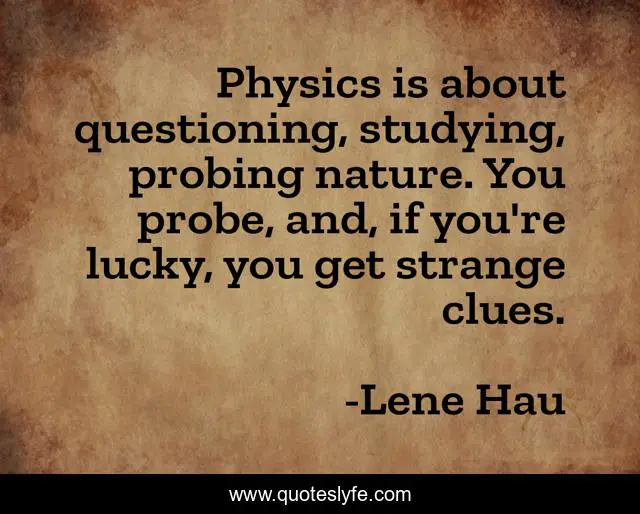 This page presents the quote "Physics is about questioning, studying, probing nature. You probe, and, if you're lucky, you get strange clues.". Author of this quote is Lene Hau. This quote is about studying, strange,.
