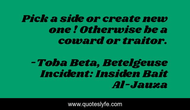 This page presents the quote "Pick a side or create new one ! Otherwise be a coward or traitor.". Author of this quote is Toba Beta, Betelgeuse Incident: Insiden Bait Al-Jauza. This quote is about character, decision, powerful,.