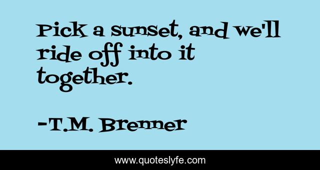 This page presents the quote "Pick a sunset, and we'll ride off into it together.". Author of this quote is T.M. Brenner. This quote is about love, romance, happiness, inspirational, enthusiasm, affection,.
