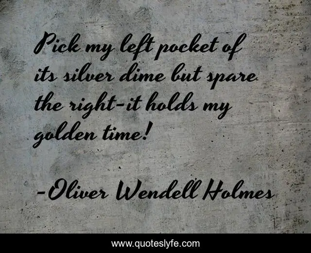 This page presents the quote "Pick my left pocket of its silver dime but spare the right-it holds my golden time!". Author of this quote is Oliver Wendell Holmes. This quote is about day, one,.