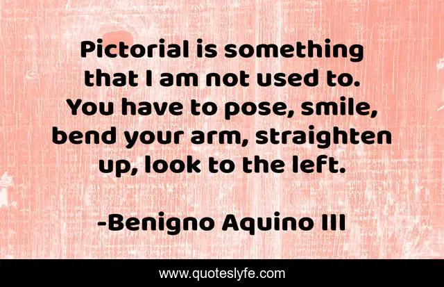 This page presents the quote "Pictorial is something that I am not used to. You have to pose, smile, bend your arm, straighten up, look to the left.". Author of this quote is Benigno Aquino III. .