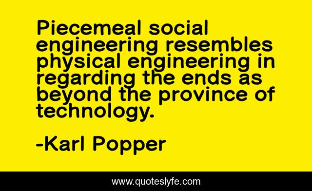 This page presents the quote "Piecemeal social engineering resembles physical engineering in regarding the ends as beyond the province of technology.". Author of this quote is Karl Popper. This quote is about engineering, beyond, social,.