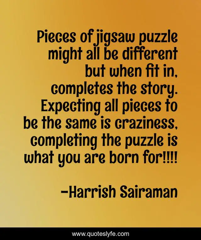 This page presents the quote "Pieces of jigsaw puzzle might all be different but when fit in, completes the story. Expecting all pieces to be the same is craziness, completing the puzzle is what you are born for!!!!". Author of this quote is Harrish Sairaman. This quote is about crazy, craziness, puzzle, jigsaw, life, pieces, born, birth, story,.
