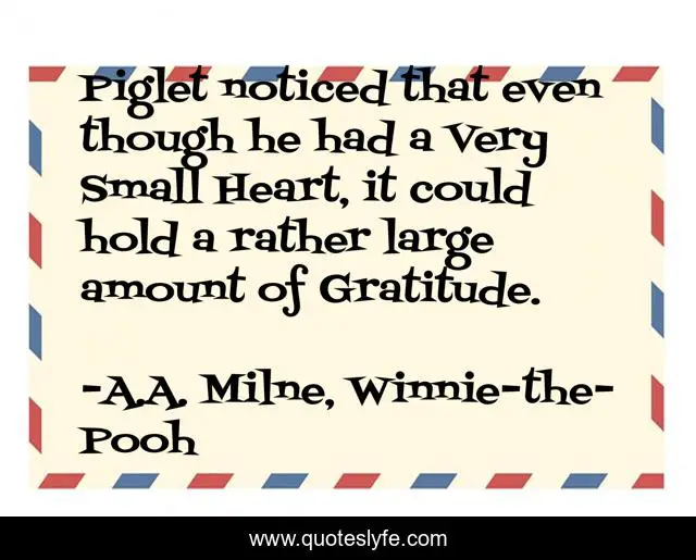 This page presents the quote "Piglet noticed that even though he had a Very Small Heart, it could hold a rather large amount of Gratitude.". Author of this quote is A.A. Milne, Winnie-the-Pooh. This quote is about gratitude, friends, friendship,.