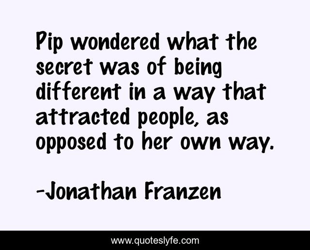 This page presents the quote "Pip wondered what the secret was of being different in a way that attracted people, as opposed to her own way.". Author of this quote is Jonathan Franzen. This quote is about attraction, different, secret,.