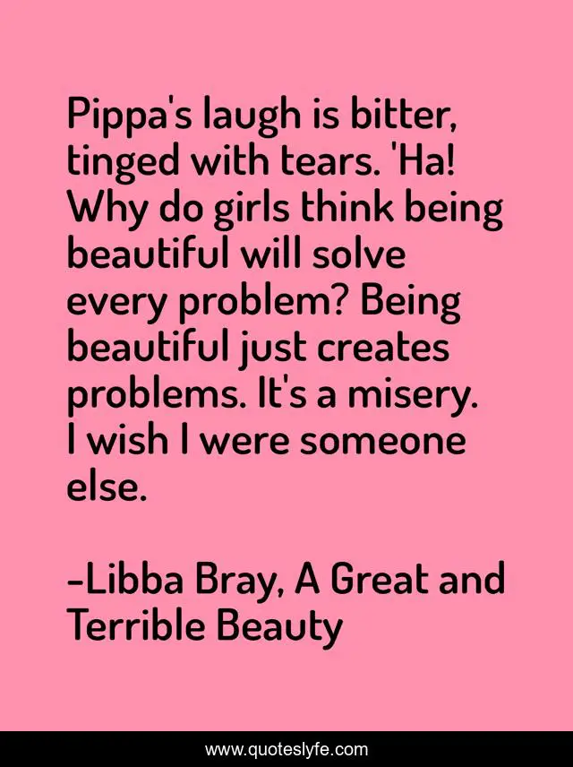 This page presents the quote "Pippa's laugh is bitter, tinged with tears. 'Ha! Why do girls think being beautiful will solve every problem? Being beautiful just creates problems. It's a misery. I wish I were someone else.". Author of this quote is Libba Bray, A Great and Terrible Beauty. This quote is about gemma-doyle, beauty, inspiration,.
