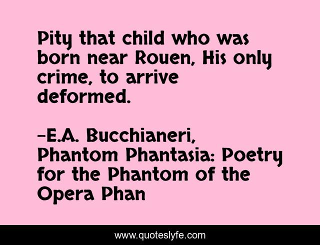 This page presents the quote "Pity that child who was born near Rouen, His only crime, to arrive deformed.". Author of this quote is E.A. Bucchianeri, Phantom Phantasia: Poetry for the Phantom of the Opera Phan. This quote is about phantom, poem, rejection, deformity, poetry, sad, erik, rouen, opera-ghost,.