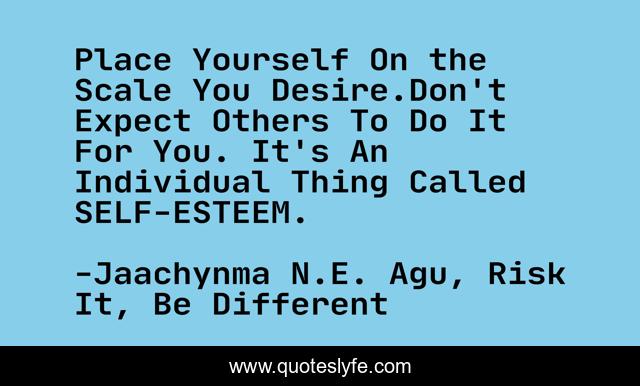 This page presents the quote "Place Yourself On the Scale You Desire.Don't Expect Others To Do It For You. It's An Individual Thing Called SELF-ESTEEM.". Author of this quote is Jaachynma N.E. Agu, Risk It, Be Different. This quote is about accomplishments, higher-life, success, greatness,.