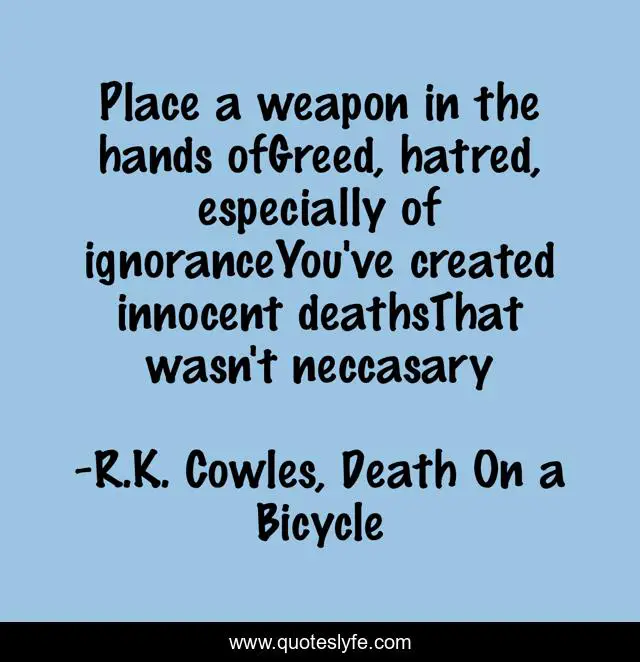 This page presents the quote "Place a weapon in the hands ofGreed, hatred, especially of ignoranceYou've created innocent deathsThat wasn't neccasary". Author of this quote is R.K. Cowles, Death On a Bicycle. .