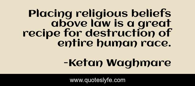 This page presents the quote "Placing religious beliefs above law is a great recipe for destruction of entire human race.". Author of this quote is Ketan Waghmare. This quote is about science, terrorism, race, human,.