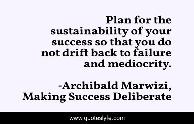 This page presents the quote "Plan for the sustainability of your success so that you do not drift back to failure and mediocrity.". Author of this quote is Archibald Marwizi, Making Success Deliberate. This quote is about life, success, behaviour, attitude, legacy, growth, purpose, inspirational, leadership,.