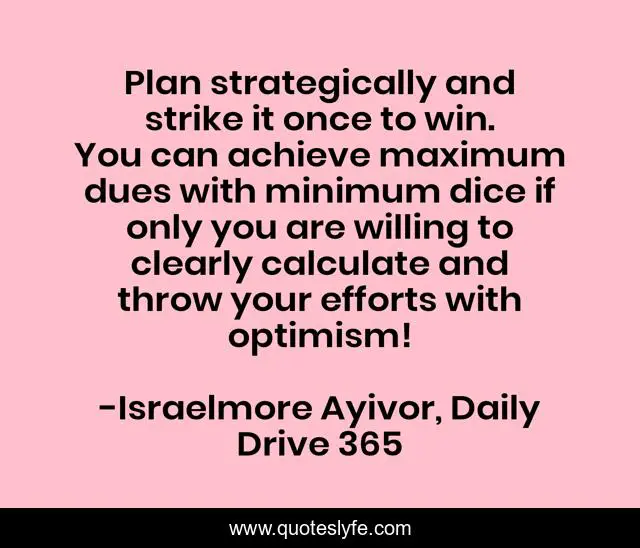 This page presents the quote "Plan strategically and strike it once to win. You can achieve maximum dues with minimum dice if only you are willing to clearly calculate and throw your efforts with optimism!". Author of this quote is Israelmore Ayivor, Daily Drive 365. This quote is about willingness, maximum, win, strategic, planning, strategy, food-for-thought, calculate, prepare,.