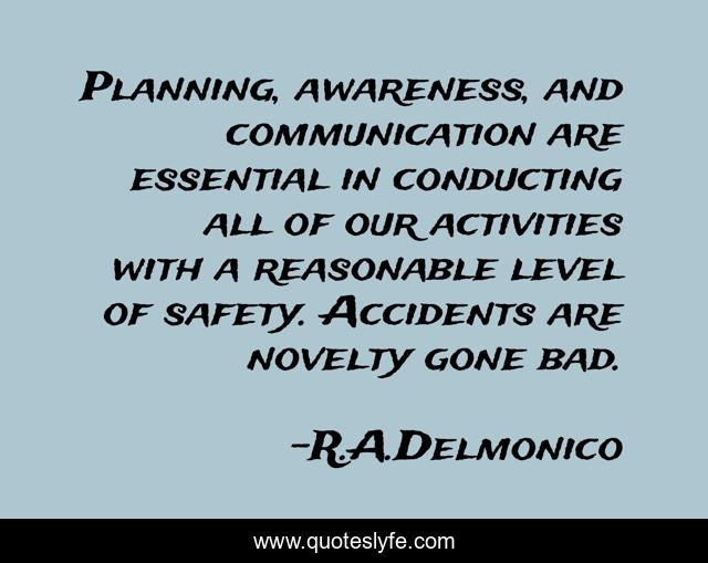 This page presents the quote "Planning, awareness, and communication are essential in conducting all of our activities with a reasonable level of safety. Accidents are novelty gone bad.". Author of this quote is R.A.Delmonico. .