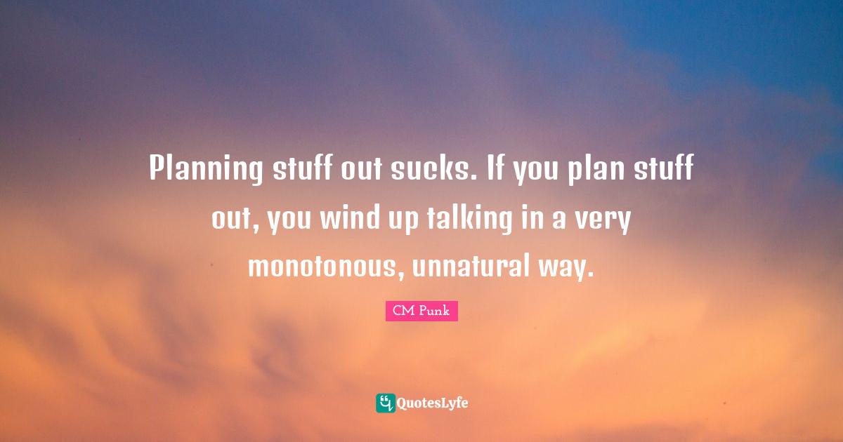 This page presents the quote "Planning stuff out sucks. If you plan stuff out, you wind up talking in a very monotonous, unnatural way.". Author of this quote is CM Punk. This quote is about planning, way, stuff, wind, monotonous, talking, unnatural,.