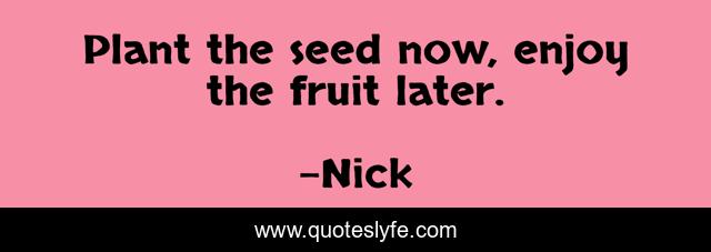 This page presents the quote "Plant the seed now, enjoy the fruit later.". Author of this quote is Nick. This quote is about enthusiasm, inspirational, success,.