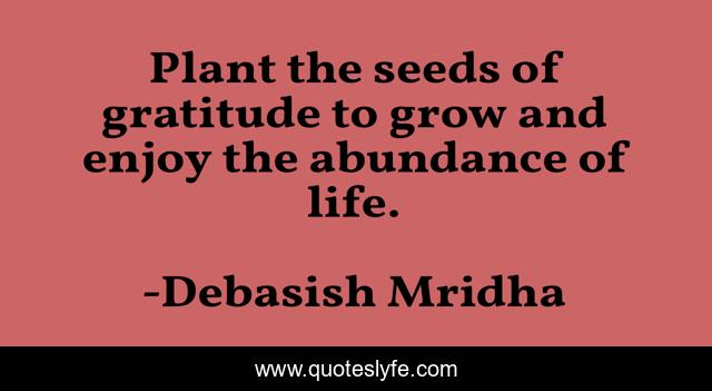 This page presents the quote "Plant the seeds of gratitude to grow and enjoy the abundance of life.". Author of this quote is Debasish Mridha. This quote is about life, love, knowledge, inspirational, intelligence, philosophy, wisdom, quotes, affection,.