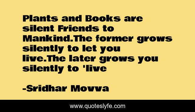 This page presents the quote "Plants and Books are silent Friends to Mankind.The former grows silently to let you live.The later grows you silently to 'live". Author of this quote is Sridhar Movva. This quote is about plants, love, nature, books, mankind, inspirationl, affection,.