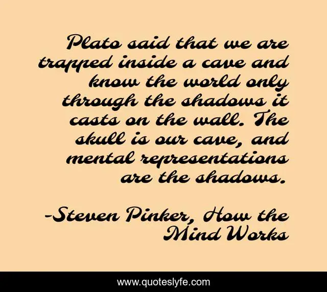 This page presents the quote "Plato said that we are trapped inside a cave and know the world only through the shadows it casts on the wall. The skull is our cave, and mental representations are the shadows.". Author of this quote is Steven Pinker, How the Mind Works. This quote is about epistemology, cave, knowledge, plato, mind, representation,.