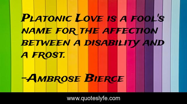 This page presents the quote "Platonic Love is a fool's name for the affection between a disability and a frost.". Author of this quote is Ambrose Bierce. .