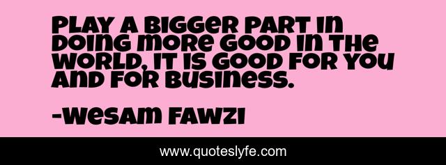 This page presents the quote "Play a bigger part in doing more good in the world, it is good for you and for business.". Author of this quote is Wesam Fawzi. This quote is about doing-the-right-thing, inspirational-life, kindness,.