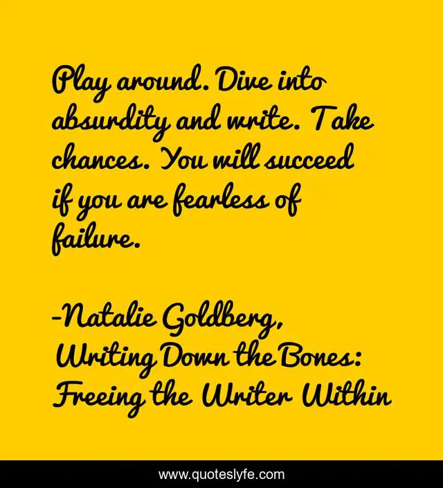 This page presents the quote "Play around. Dive into absurdity and write. Take chances. You will succeed if you are fearless of failure.". Author of this quote is Natalie Goldberg, Writing Down the Bones: Freeing the Writer Within. This quote is about success, writing,.