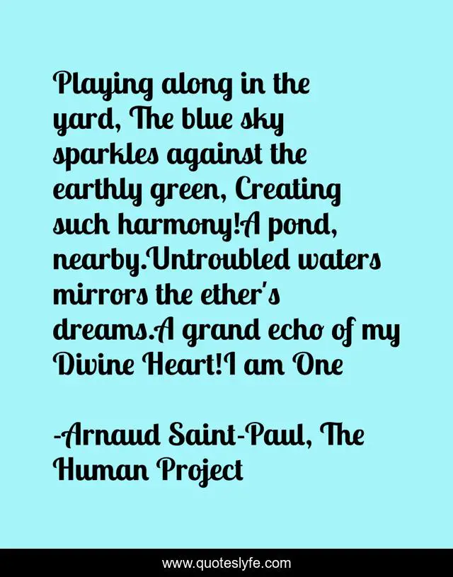 This page presents the quote "Playing along in the yard, The blue sky sparkles against the earthly green, Creating such harmony!A pond, nearby.Untroubled waters mirrors the ether's dreams.A grand echo of my Divine Heart!I am One". Author of this quote is Arnaud Saint-Paul, The Human Project. This quote is about heart, divine, spirituality, inspirational, enthusiasm,.
