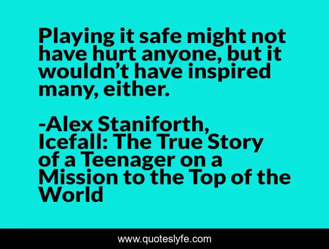 This page presents the quote "Playing it safe might not have hurt anyone, but it wouldn’t have inspired many, either.". Author of this quote is Alex Staniforth, Icefall: The True Story of a Teenager on a Mission to the Top of the World. This quote is about playing-safe, inspiring, taking-risks, risk, inspiration,.