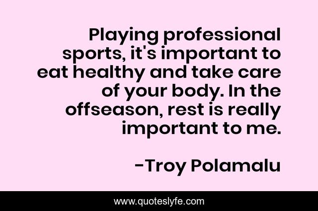 This page presents the quote "Playing professional sports, it's important to eat healthy and take care of your body. In the offseason, rest is really important to me.". Author of this quote is Troy Polamalu. This quote is about me, healthy, professional,.