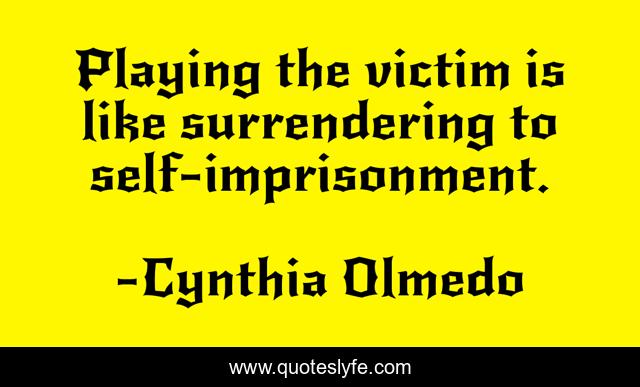 This page presents the quote "Playing the victim is like surrendering to self-imprisonment.". Author of this quote is Cynthia Olmedo. This quote is about enthusiasm, inspirational,.