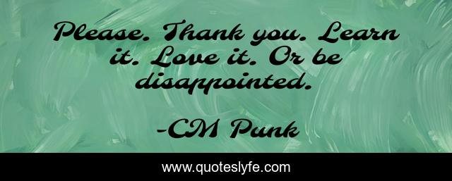 This page presents the quote "Please. Thank you. Learn it. Love it. Or be disappointed.". Author of this quote is CM Punk. This quote is about respect, decency,.