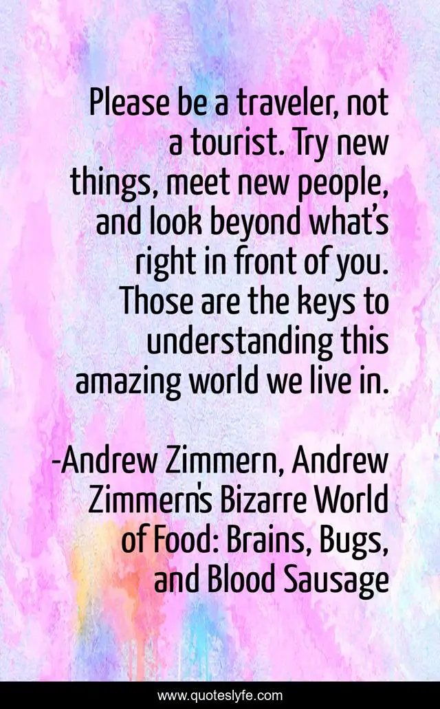 "Andrew Zimmern, Andrew Zimmern's Bizarre World of Food: Brains, Bugs, and Blood Sausage Quotes." Quoteslyfe.com, 2025. Fri. 05 Dec. 2025. <https://www.quoteslyfe.com/quote/Please-be-a-traveler-not-a-tourist-158538>.
