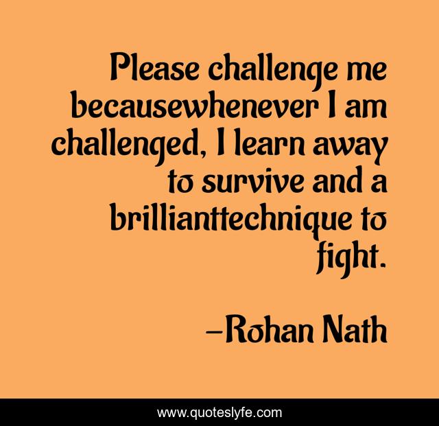 This page presents the quote "Please challenge me becausewhenever I am challenged, I learn away to survive and a brillianttechnique to fight.". Author of this quote is Rohan Nath. This quote is about challenge, life, survival,.