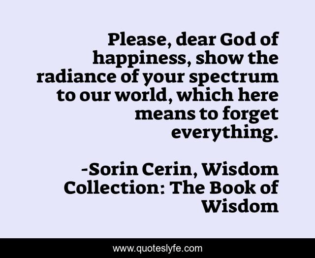 This page presents the quote "Please, dear God of happiness, show the radiance of your spectrum to our world, which here means to forget everything.". Author of this quote is Sorin Cerin, Wisdom Collection: The Book of Wisdom. This quote is about god, life, love, affection, world,.